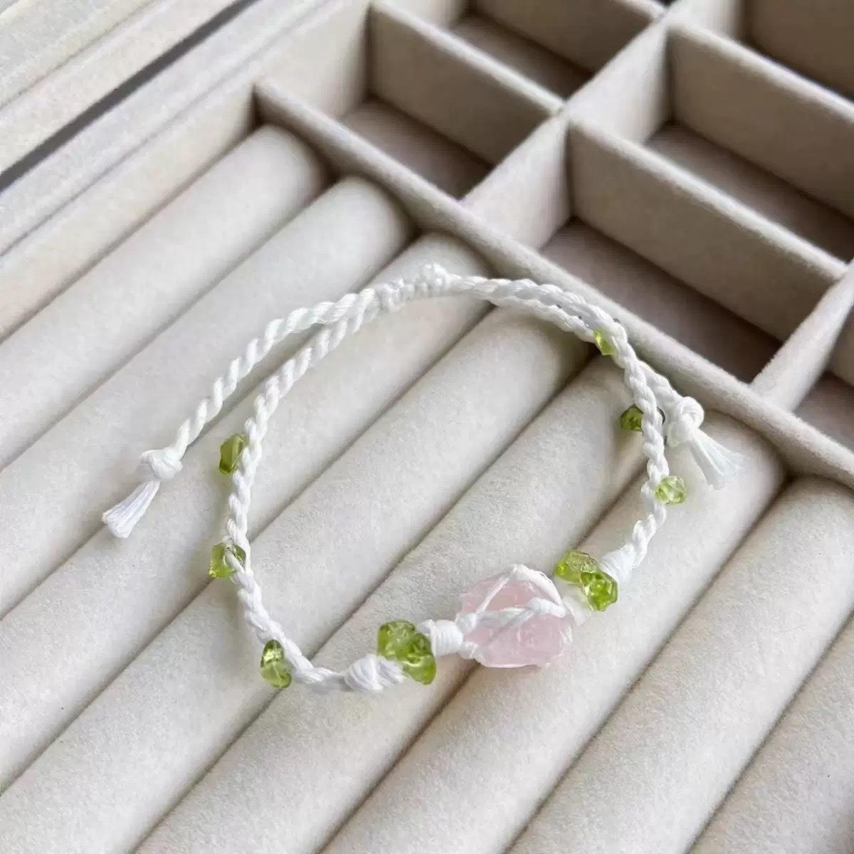職人が一本一本心を込めて編んだ白いコードに、ローズクォーツの淡いピンクとオリーブ石の優しい緑が調和した、女性のためのブレスレットです。