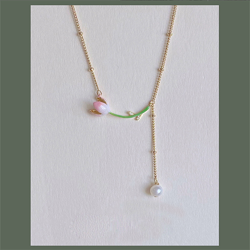 職人が丁寧に彩色を施したチューリップの造花と、上質な真珠の組み合わせが魅力的な、女性のためのネックレスです。